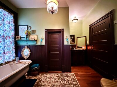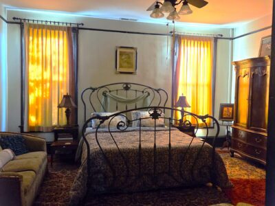 You’ll find a breakfast card in your room when you arrive. Please leave it in the foyer with the days and times you will take breakfast. Other meals may be prepared in the shared kitchen. We make space in the full fridge for a few guest groceries that won’t fit in your mini fridge. You’re welcome to coffee whenever it’s made in the kitchen. The balcony is open for use all day into the evening. If you prefer showers to baths, the second bathroom in the foyer has a clawfoot tub with a shower fixture in it. You are more than welcome to use it. If you feel a burst of creativity, Rusty is happy to share materials and to inspire you with some of his own work. We can give you a full tour of the first floor or send you exploring by request if there are no other private guests below us. Feel free to take a walk around the town square and through the Silk Stocking District. Guided tours will be available soon.