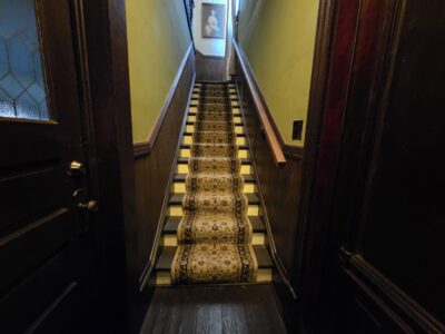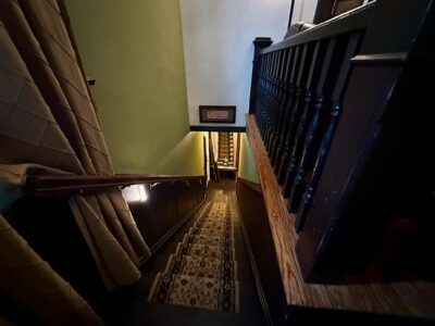 Located upstairs for added privacy, this apartment blends preserved architectural detail with comfortable modern touches. Original wood tones, tall ceilings, and classic Victorian character create a warm and inviting atmosphere, while the elevated setting offers a quiet retreat above the main level.